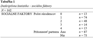 Pre lepšiu prehľadnosť deskriptívnej štatistiky sa môžeme pozrieť do tabuľky č. 1, ktorá zahŕňa údaje o sociálnych faktoroch.