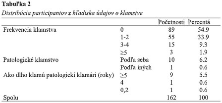 V tabuľke č. 2 môžeme vidieť distribúciu participantov z hľadiska údajov o klamstve, kde skupinu pravdovravných ľudí (frekvencia klamstva = 0) tvorila väčšina vzorky (n = 89; 54,9%); 1 až 2 klamstvá uviedlo 55 respondentov (33,9%), 3 až 4 klamstvá 15 respondentov (9,3%) a 5 alebo viac klamstiev 3 respondenti (1,9%). Na základe otázok týkajúcich sa patologického klamstva, tvorilo skupinu patologických klamárov 11 respondentov (n = 11; 6,8%), pričom  z tejto skupiny väčšina uviedlo, že klamú 5 alebo viac rokov (n = 9; 5,5%), 4 roky (n = 1; 0,6%), alebo klame 0,2 roku (n = 1; 0,6%).